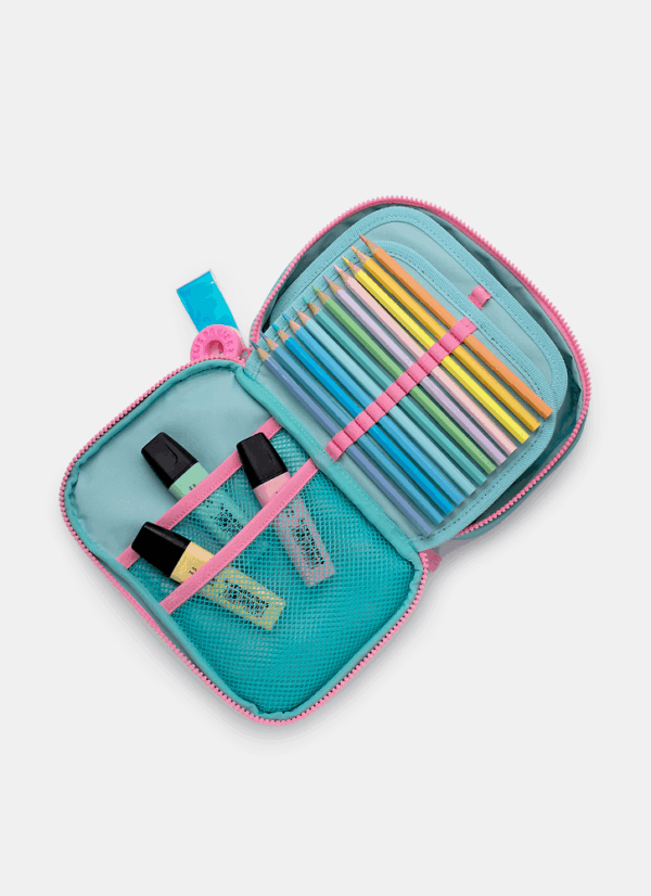 O Estojo Grande Verde Água é perfeito para quem busca organização, praticidade e um visual moderno no dia a dia. Com design funcional e cor delicada, ele atende desde o uso escolar até o ambiente de trabalho. Confeccionado em poliéster (nylon) resistente, possui dois compartimentos principais com fechamento em zíper, ideais para separar e organizar lápis, canetas, marcadores e outros acessórios. Internamente, conta com aba organizadora com 24 elásticos, além de bolsos em tela que facilitam a visualização dos itens. Na parte externa, possui bolso posterior flat, perfeito para guardar objetos menores, e acompanha um chaveiro diferenciado que traz um toque especial ao produto.