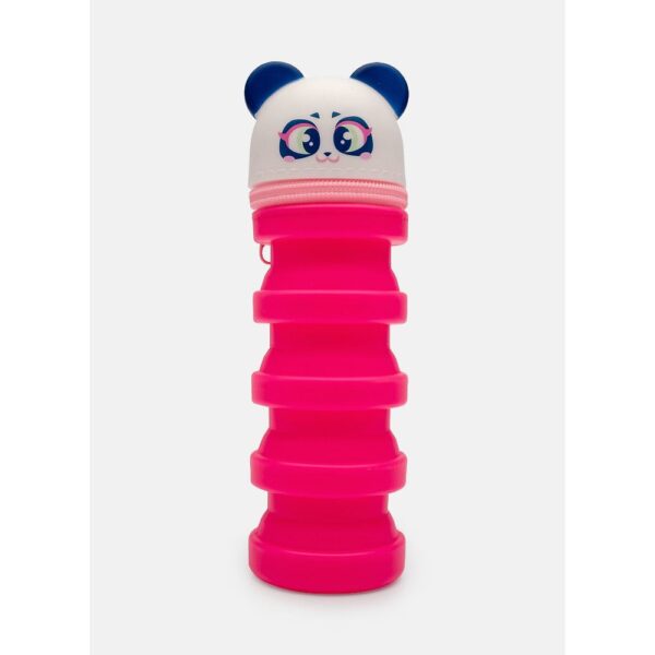 Possui formato retrátil (menor quando vazio), fechamento por zíper, aplique e estampa de Panda.