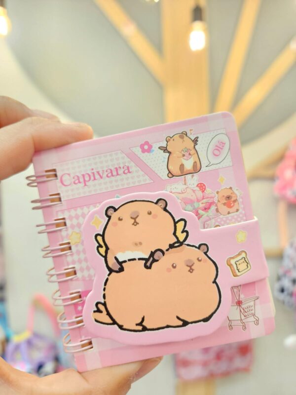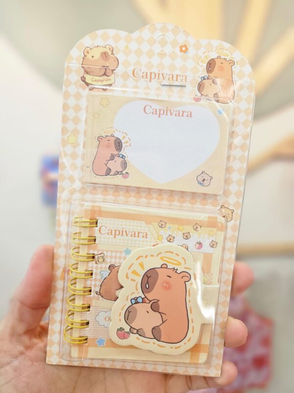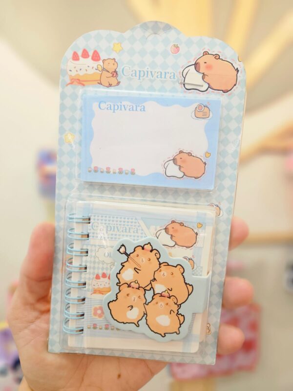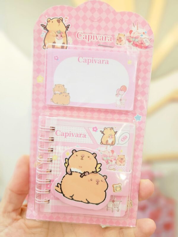 Deixe a criatividade voar alto com este kit super fofo contendo uma caderneta com fecho e um bloco de notas adesivo no tema de Capivaras!