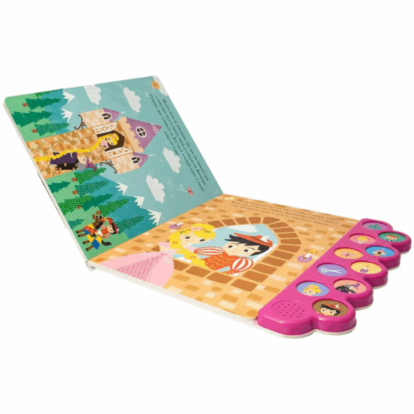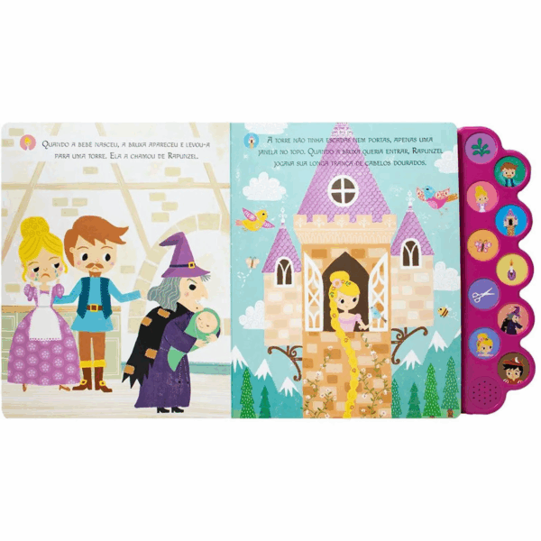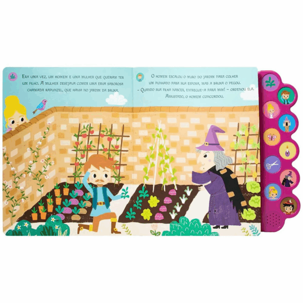 Ao todo são 10 páginas com 10 botões sonoros que reproduzem efeitos especiais da narrativa – desde o tilintar da campainha até o som suave da floresta ou o coro de uma fada madrinha!