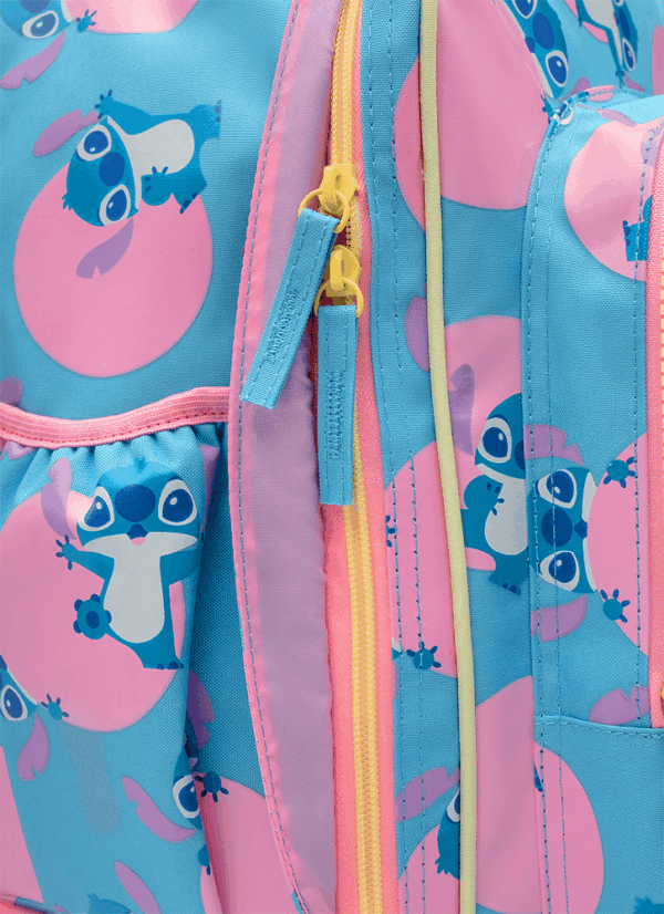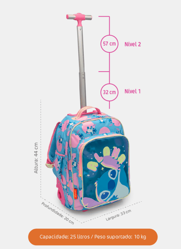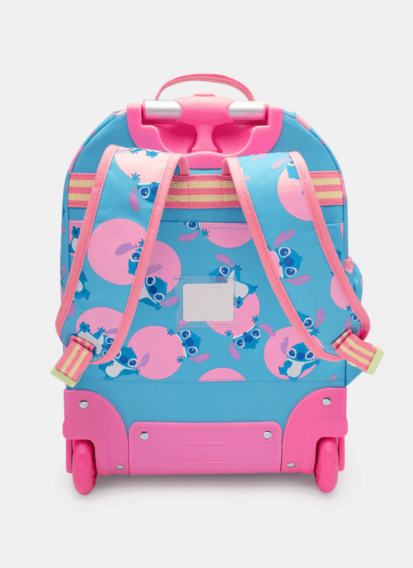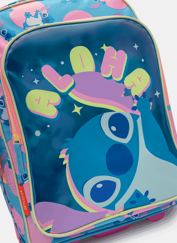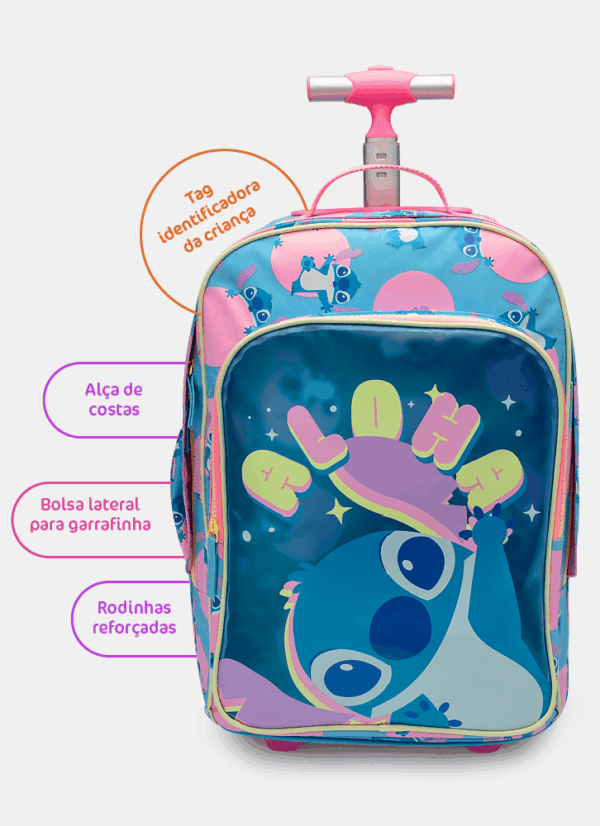Mochila em nylon com rodinha. Bolso frontal médio em PVC com transparência com estampa de Stitch, alça de mão, alças de costa removíveis com regulagem e puxador com duas alturas de regulagem. Proteção extra entre as rodas na parte de trás.