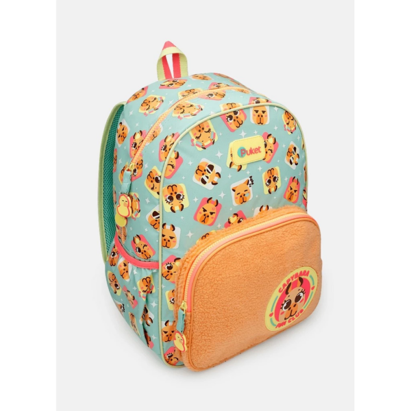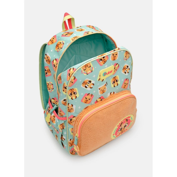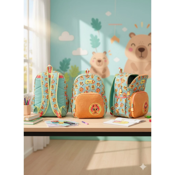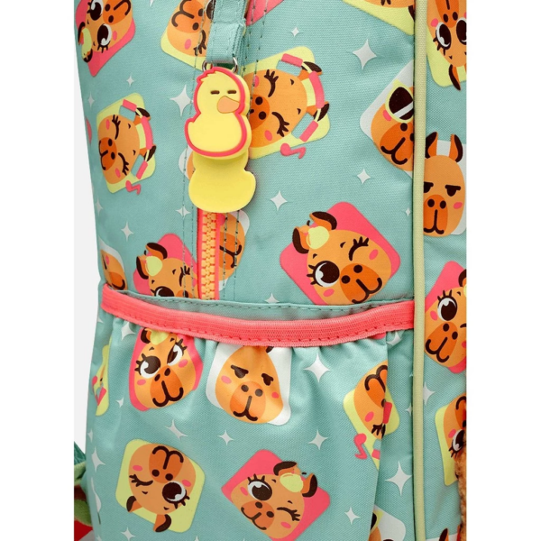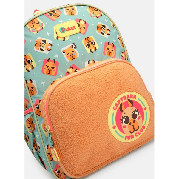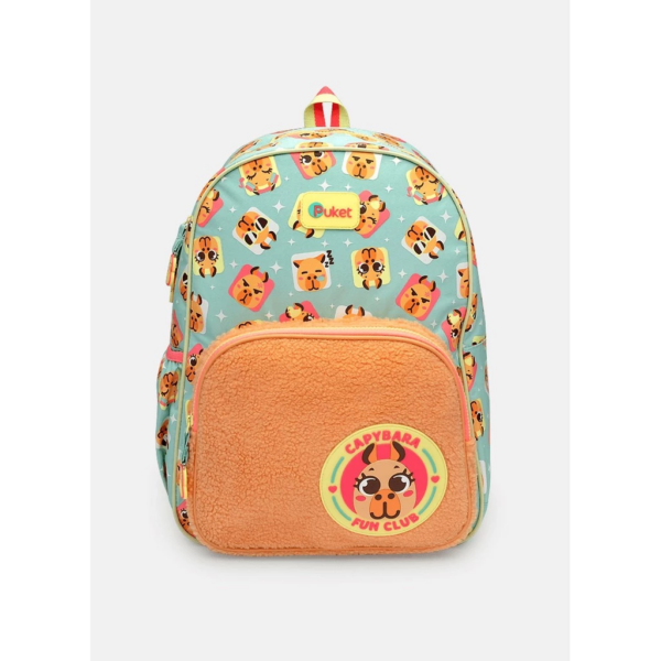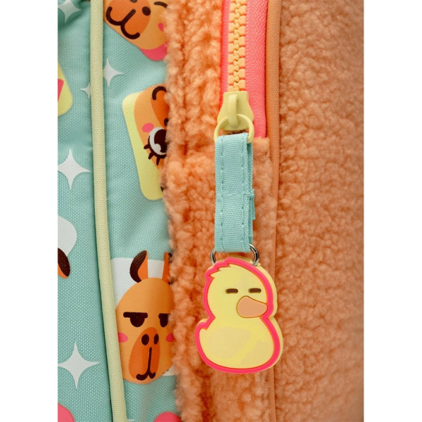 Mochila grande em nylon com estampa de capivara, bolso frontal em sherpa com selo de capivar. Possui fechamento por zíper e bolsinho lateral para garrafinha.