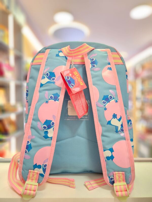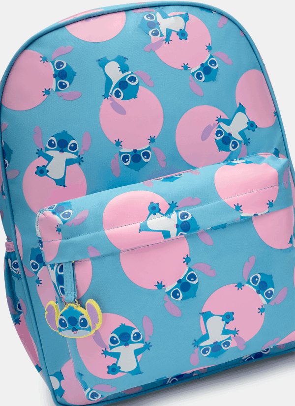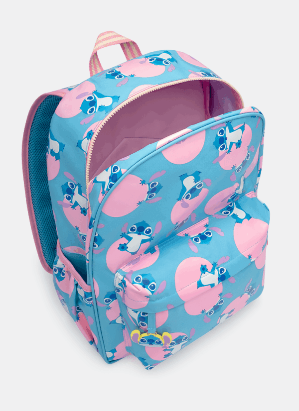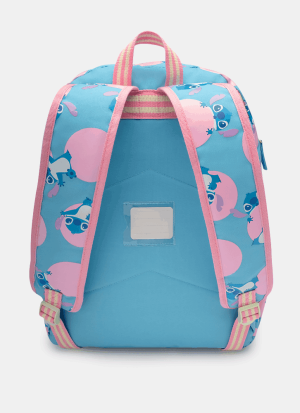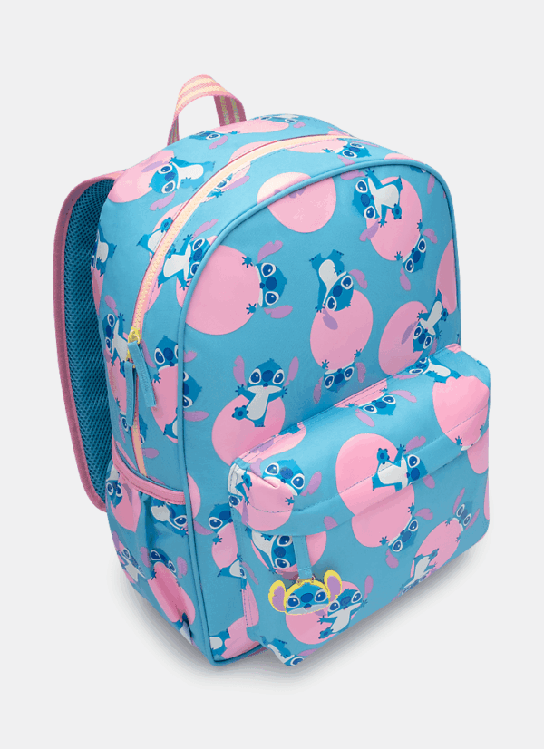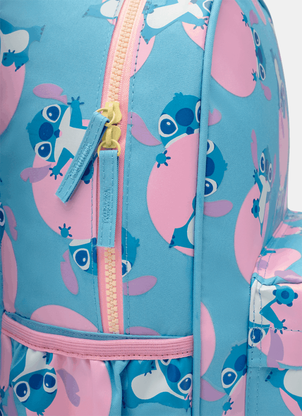 Mochila grande em nylon com estampa do Stitch. Bolso frontal estampado, detalhe emborrachado no bolso frontal. Possui fechamento por zíper e bolsinho lateral para garrafinha.